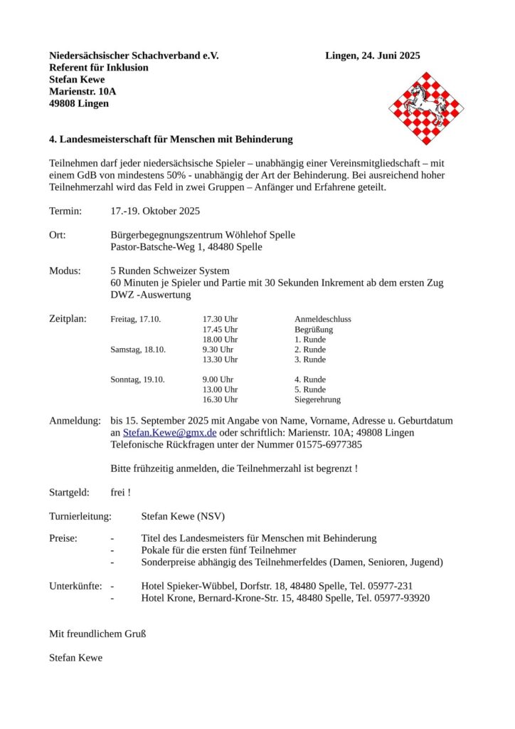 - Nachrichtenblatt September 2025Schnellschachturnier in Lingen Artur Weber gewinnt das U10-Turnier mit 8 aus 8 ! Unerwartet klar gewann Artur das Turnier in… Nachrichtenblatt September 2025 weiterlesen